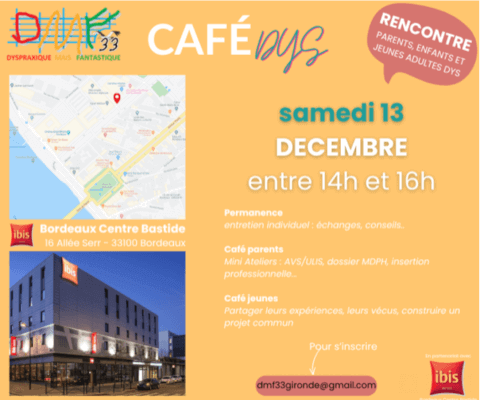 DMF33 vous invite à son Café DYS, rencontre Parents, Enfants et Jeunes Adultes DYS Au programme Permanence entretiens individuels : échanges, conseils… Café parents Mini-ateliers :AVS / ULIS Dossier MDPH Insertion professionnelle… et d’autres sujets de soutien aux familles. Café jeunes échanges entre jeunes :partage d’expériences discussions autour de leurs vécus construction d’un projet commun Inscription obligatoire : [email protected] Organisé par :DMF33 – Dyspraxique Mais Fantastique, en partenariat avec l’Hôtel Ibis Bordeaux Centre Bastide. Samedi 13 décembre Entre 14h et 16h Ibis Bordeaux Centre Bastide 16 Allée Serr, 33100 Bordeaux