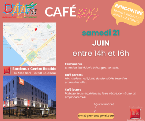 🌟 Café DYS à Bordeaux – Samedi 21 juin | 14h - 16h 📍 *Hôtel Ibis Bordeaux Centre Bastide – 16 allée Serr, 33100 Bordeaux* Parents, enfants, jeunes adultes concernés par les troubles DYS… Ce moment est pour vous ! 🤝 Venez partager, échanger, poser vos questions et repartir avec des clés concrètes pour avancer 💡 🟠 AU PROGRAMME : 👂 Permanence individuelle : écoute, conseils, orientation 👨👩👧 Café Parents : • AESH & ULIS • Dossier MDPH • Insertion pro 🧑🤝🧑 Café Jeunes : • Partage d’expériences • Projets communs à imaginer ensemble ! ☕ Ambiance chaleureuse garantie, en partenariat avec l’hôtel Ibis Bordeaux Centre Bastide. 📧 Inscription gratuite par mail : [email protected] 📣 On vous attend nombreux !