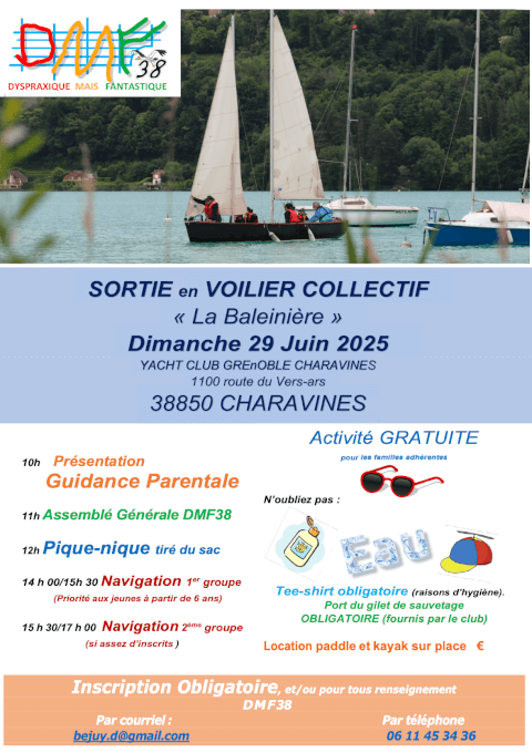 DMF38 organise une journée conviviale en voilier collectif au Yacht Club de Charavines.Au programme : présentation, AG, pique-nique et navigation !Activité gratuite pour les familles adhérentes. 1100 route du Vers-ars, 38850 Charavines Inscription obligatoire : [email protected] Infos : 06 11 45 34 36
