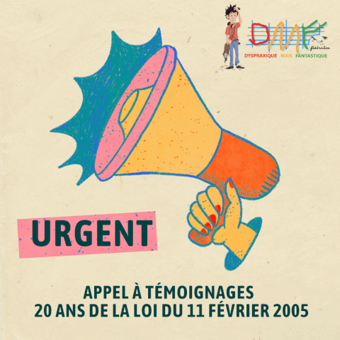 À l’occasion des 20 ans de la loi du 11 février 2005, la Fédération Dyspraxique Mais Fantastique lance un appel à témoignages. Partagez votre parcours ou celui de votre enfant : où en sommes-nous aujourd’hui ? Quelles difficultés rencontrez-vous ? Quelles réussites et évolutions avez-vous constatées ? Vos témoignages, anonymisés, seront publiés chaque semaine sur notre site à partir du 11 février 2025. Vous pouvez dès à présent nous les envoyer ici : [email protected] ⚠️ Format demandé : une seule page Merci pour votre contribution ! Ensemble, faisons entendre nos voix.