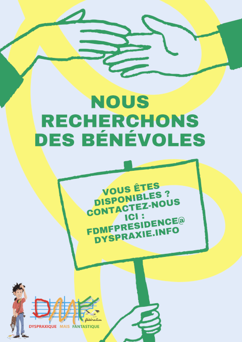 Nos associations départementales (DMF54, DMF12, DMF34…) et la Fédération DMF ont besoin de vous ! Rejoignez-nous comme bénévole et aidez-nous à faire la différence pour les personnes dyspraxiques ! Vous êtes disponibles ? contactez-nous ICI : [email protected]
